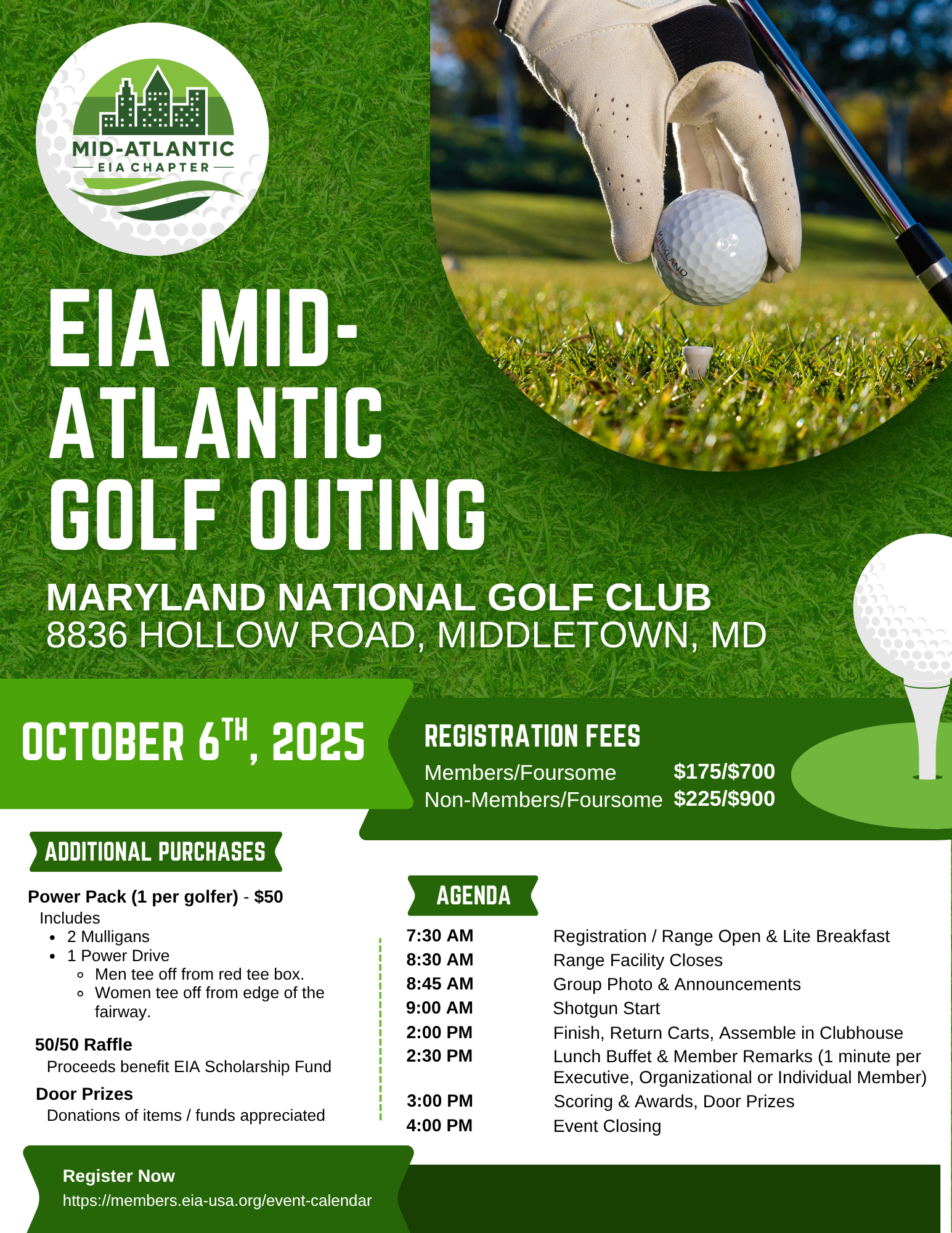 Interested in membership with EIA and the Mid-Atlantic Chapter? One person from each Non-Member foursome is eligible for EIA membership. Email info@eia-usa.org for more information.